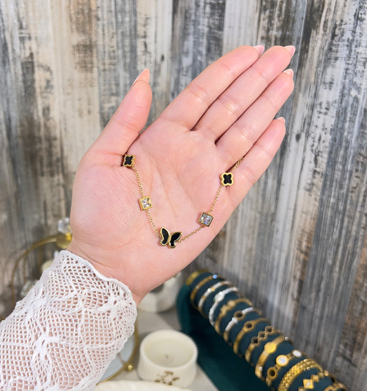 Gold Butterfly Charm Bracelet with Black Clovers | Waterproof & Tarnish-Free