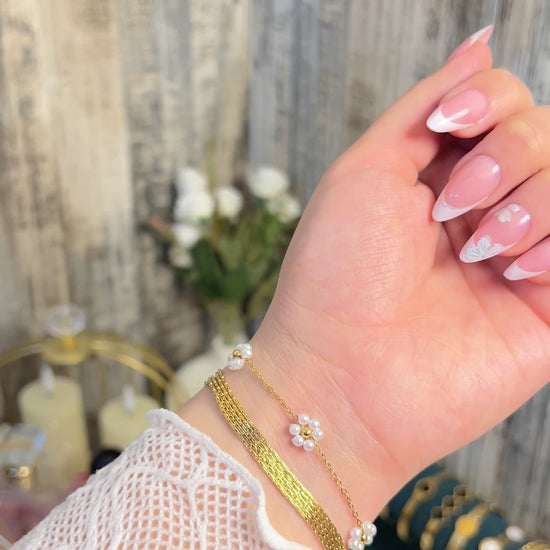 18K Gold Plated Dainty Pearl Flower & Multi-Strand Mesh Bracelet Set | Anti-Tarnish Floral Jewelry