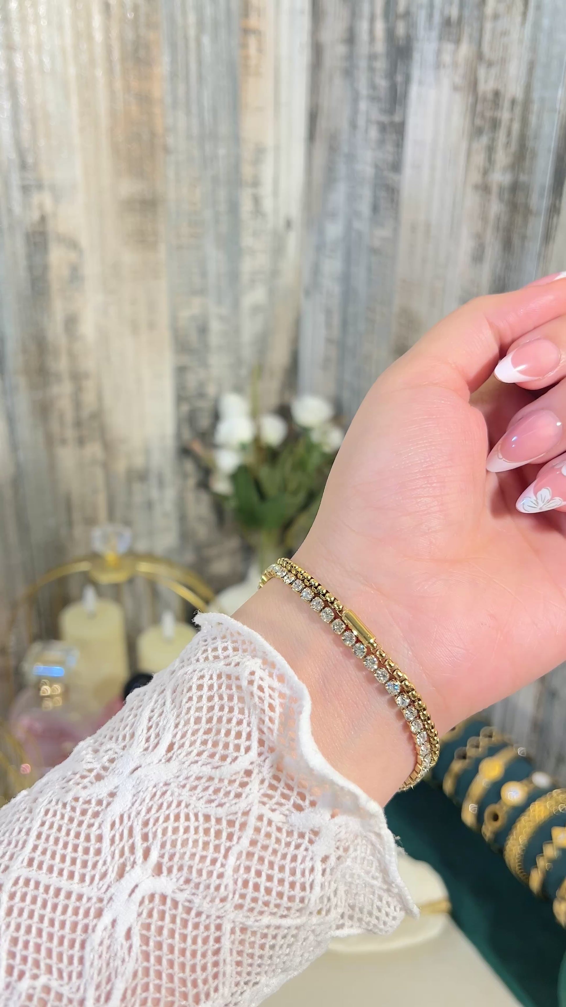 Product Description: Add a touch of effortless luxury to your wrist. Our Crystal Tennis Duo features a classic line of brilliant, hand-set crystals paired with a sleek, 18K gold-plated box chain. This pre-styled set offers the perfect balance of sparkle and gold.