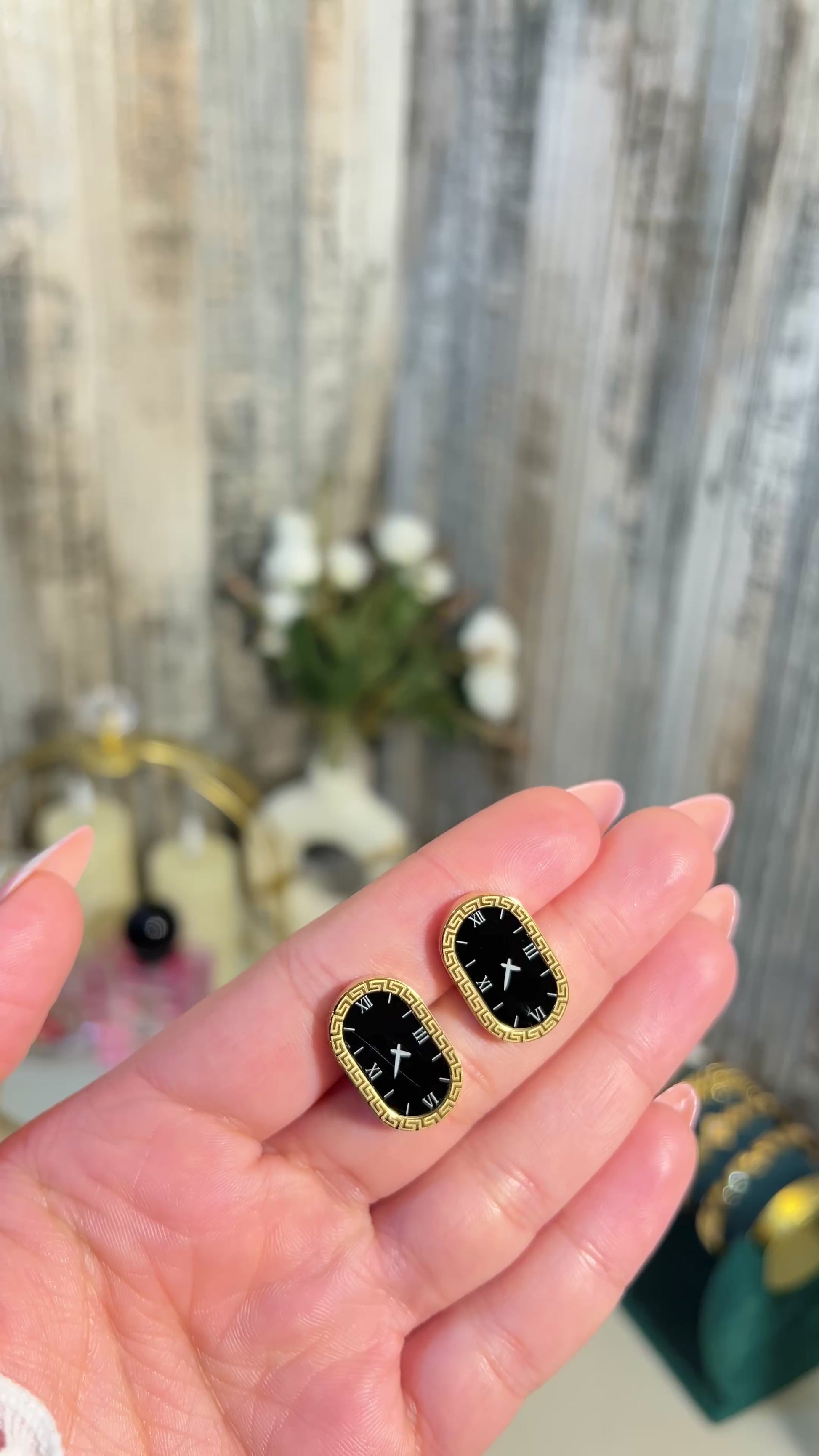 Add a touch of intellectual luxury to your style with our Vintage Roman Clock Studs. These unique oval earrings feature a deep midnight-black enamel face adorned with classic golden Roman numerals and watch hands. Encased in a detailed golden frame with a traditional Greek-key pattern, they offer a scholarly yet high-fashion look that never goes out of style.