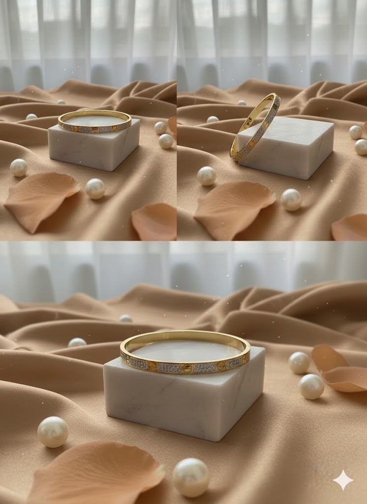 Make a bold statement with our Luxury Crystal-Pave Gold Bangle. This masterpiece combines the iconic industrial screw motif with a modern "icy" look. Covered in hundreds of shimmering micro-crystals, it’s designed to catch the light from every angle, making it the perfect accessory for those who love high-end fashion.